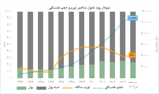 بررسی روندهای یک دهه اخیر نشان میدهد که اجرای سیاستهای پولی انبساطی و رشد پرشتاب نقدینگی، بهویژه در سالهای ۱۳۹۷ تا ۱۴۰۱، محرک اصلی تورمهای سنگین بوده است. افت نسبی نرخ تورم در فاصله ۱۴۰۲ تا ۱۴۰۳ عمدتاً به تغییر ترکیب نقدینگی و افزایش سهم شبهپول بازمیگردد؛ عاملی که بهدلیل سرعت چرخش پایینتر، ورود تدریجیتری به جریان مبادلات دارد.