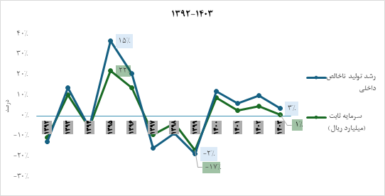 .بررسی روند سالهای ۱۳۹۲ تا ۱۴۰۳ نشان میدهد که رشد اقتصادی و رشد تشکیل سرمایه ثابت ناخالص در بسیاری از مقاطع همسو بوده و جهتگیری مشابهی داشتهاند.