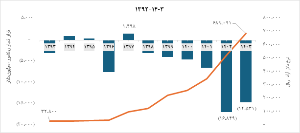 بررسی نمودار نشان میدهد که تراز تجاری غیرنفتی ایران در بازه زمانی ۱۳۹۳–۱۴۰۳ همواره منفی باقی مانده و در سالهای ۱۴۰۲ و ۱۴۰۳ به اوج کسری یک دهه گذشته رسیده است؛ بهطوریکه در نیمه نخست ۱۴۰۳ کسری حدود ۱۴.۵ میلیارد دلار ثبت شده است. همزمان، نرخ دلار آزاد روندی پیوسته و چشمگیر را تجربه کرده.