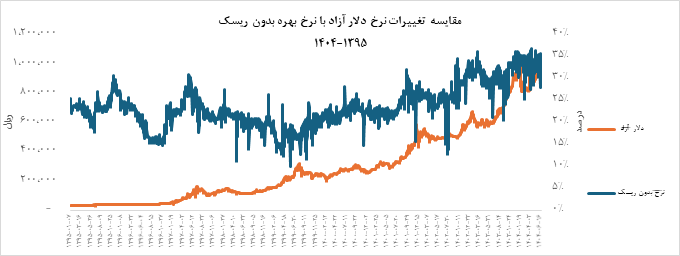همانطور که در نمودار ذیل قابل مشاهده است دادههای نرخ دلار آزاد و نرخ بهره بدون ریسک طی سالهای ۱۳۹۵ تا ۱۴۰۴، میتوان نتیجه گرفت که شدت و جهت رابطه بین این دو متغیر در کوتاهمدت ثابت نبوده و بهطور مکرر تغییر کرده است؛ بهگونهای که در برخی دورهها همفاز و دارای رابطه مستقیم و در برخی دورهها ناهمفاز و معکوس عمل کردهاند. در بازههایی که افزایش نرخ بهره بهعنوان ابزار سیاست انقباضی پیش از جهش ارزی رخ داده، اثر تقویتی بر ارزش پول ملی از مسیر جذب سرمایه و کاهش انتظارات تورمی مشاهده شده است. در مقابل، زمانی که افزایش نرخ بهره پس از جهش ارزی و با تأخیر انجام شده، این تغییرات بیشتر نقش واکنشی داشته و منعکسکننده تضعیف پول ملی بوده است.