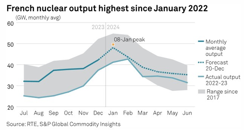 چه اتفاقی میافتد؟ تولید هستهای فرانسه که در دو زمستان گذشته به کف خود رسید، با تولید 50 گیگاوات در اواسط ژانویه برای اولین بار در سه سال گذشته بهبود یافت. این بهبود به جبران تاثیر صعودی قیمت ناشی از پیشبینی سرما برای بالا بردن اوج تقاضای برق در فرانسه به بالای 80 گیگاوات برای اولین بار در زمستان امسال کمک کرده است. بازیافت هستهای، در کنار انرژی باد بی سابقه و بهبود تولید برق آب، صادرات برق فرانسه را به بالاترین حد خود در اوایل ژانویه به بالای 20 گیگاوات رساند. تحلیلگران S&P Global پیشبینی میکنند که میانگین انرژی هستهای فرانسه در ژانویه به حدود 48 گیگاوات برسد که بالاترین میانگین ماهانه از ژانویه 2021 است. تاخیرهای مداوم تعمیر و نگهداری و شروع زودهنگام فصل تعمیر و نگهداری در سال 2024 احتمال افزایش بیشتر در اواخر این ماه را محدود میکند. در منحنی، پریمیوم ریسک زمستانی تا حد زیادی در اواخر سال 2023 در سطوح ذخیره سازی گاز قیمت گذاری شد. قراردادهای برق سال آینده فرانسه در حال حاضر نزدیک به سطوح قبل از بحران در حدود Eur85/MWh معامله میشود و تنها اسپانیا از بازارهای همسایه به صورت سالانه با کاهش مواجه است.